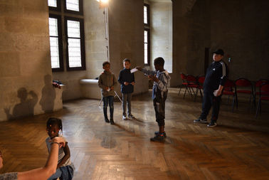 8 jeunes du service jeunesse de Compiègne sont venus passer la journée au château avec un animateur et 4 jeunes de la PRE de Compiègne sont aussi présents pour leur podcast. La matinée est consacrée à la visite théâtralisée avec 3 comédiens et 1 guide puis l'après-midi consiste en un atelier artistique de réalisation de fresques inspirées de celles de Viollet Le Duc.